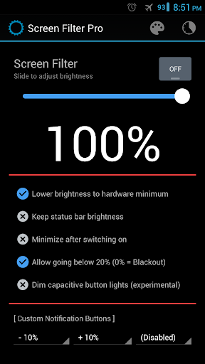 Overview: Screen Filter can lower your screen brightness to extremely low levels, to help prevent eyestrain during the night. Includes notification controls for Jelly Bean devices.